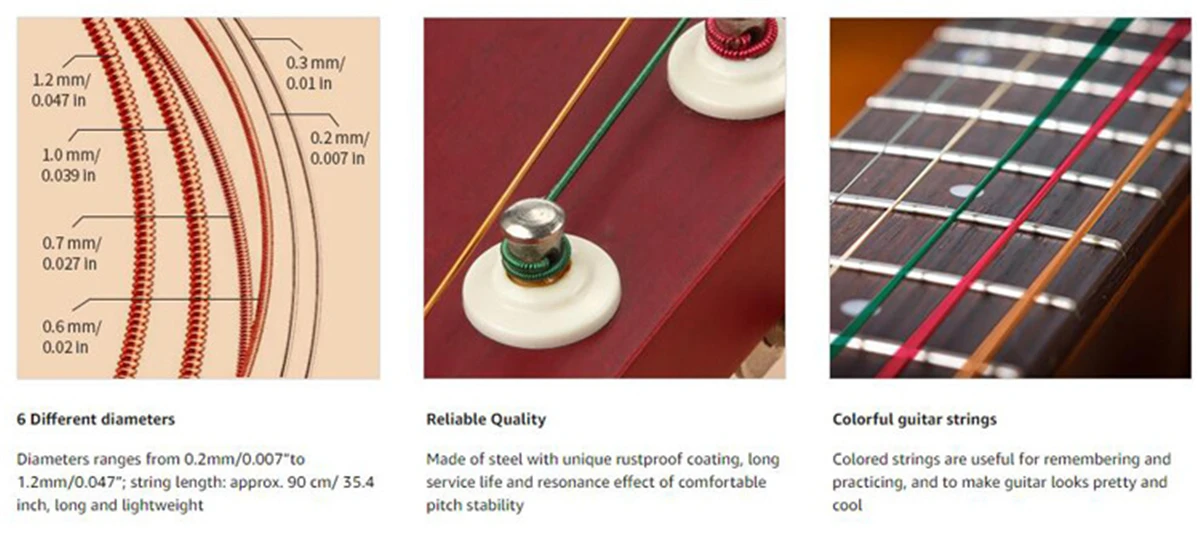 Suit for: colored guitar strings are helpful for the guitar beginners to remember and practice.